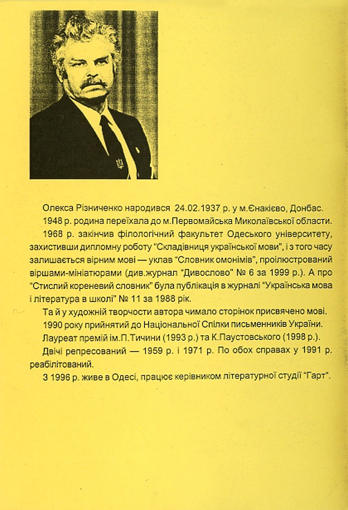 Олекса Різниченко свого часу скінчив філологічний факультет Одеського університету, викладав у школі українську мову та літературу. Уклав словник омонімів та працює над стислим кореневим словником української мови, а отже, досить добре знайомий з предметом. До того ж, тему він піднімає таку, що досі була terra inkognito: не можна було ставити питання, чим наша мова багатша за інші. Дозволялося писати, що вона співуча, красива, солов’їна, друга за мелодійністю у світі, барвінкова, калинова, чудова тощо.