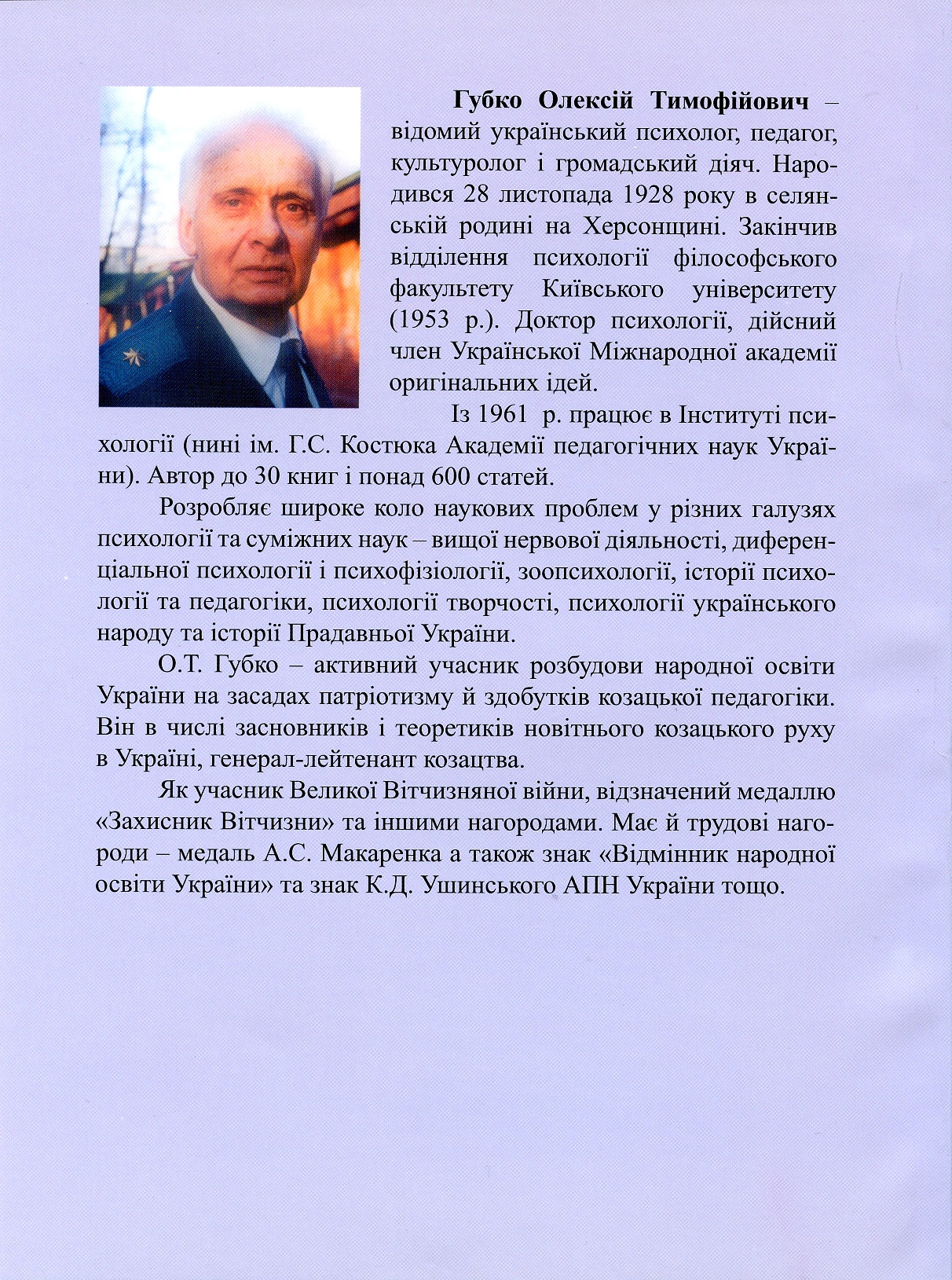 Губко Олексій Тимофійович – народився 28 листопада 1928 року в селянські родині на Херсонщині. Закінчив відділення психології філософського факультету Київського університету (1953 р.). Доктор психології, дійсний член Української Міжнародної академії оригінальних ідей.