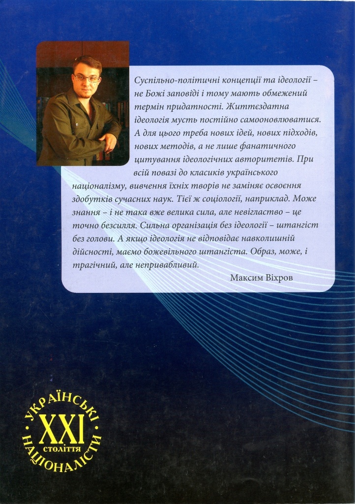 Максим Віхров: “Суспільно-політичні концепції та ідеології – не Божі заповіді і тому мають обмежений термін придатності. Життєздатна ідеологія мусить постійно самооновлюватися. А для цього потрібно нових ідей, нових підходів, нових методів, а не лише фанатичного цитування ідеологічних авторитетів. При всій повазі до класиків українського націоналізму, вивчення їхніх творів не заміняє освоєння здобутків сучасних наук. Тієї ж соціологія, наприклад. Може знання – і не така вже велика сила, але невіглство – це точно безсилля. Сильна організація без ідеології – штангіст без голови.  А якщо ідеологія не відповідає навколишній дійсності, маємо божевільного штангіста. Образ, може, і трагічний, але непривабливий.”