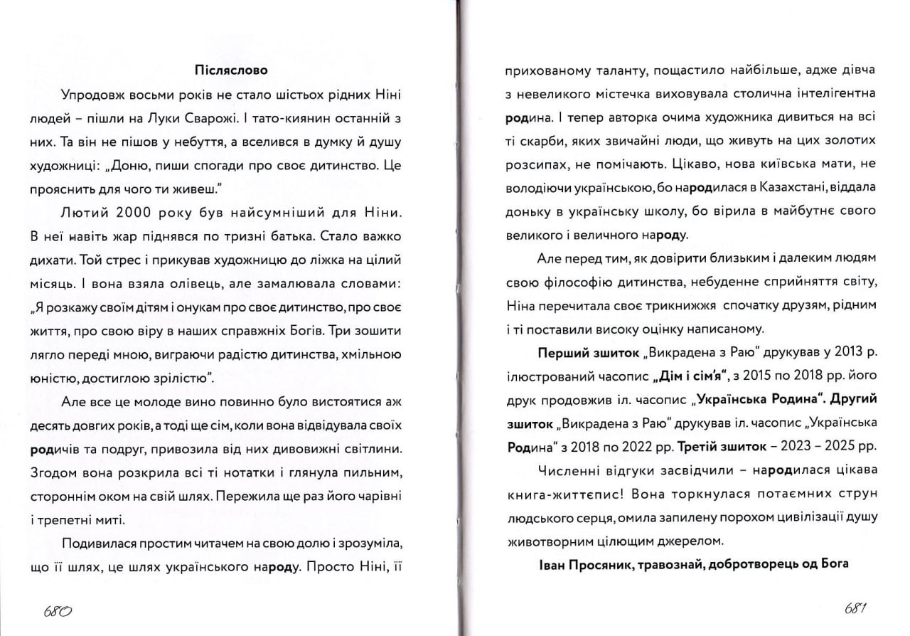 *Відгук про книжку. Ольга: Я у захваті від книжок – ти як Мавка лісова! Звідки ти береш стільки слів поетично-романтичних, щоб так передати красу світу? Хочеться ще тебе слухати. Ти не уявляєш, як я люблю природу, ліс! Як мені цього не вистачає, – душа плаче! У тебе така чудова мова, начебто проста, але така різноманітна й багата. Дякую за чудові книжки! Ти не перестаєш мене вражати, це дійсно титанічна праця, – зібрати таку кількість інформації. Боги прислали тебе на цю землю, подарували небуденне сприйняття світу, незвичайну памʼять про життя, дитинство, про людей, – щоб створити цей шедевр.*